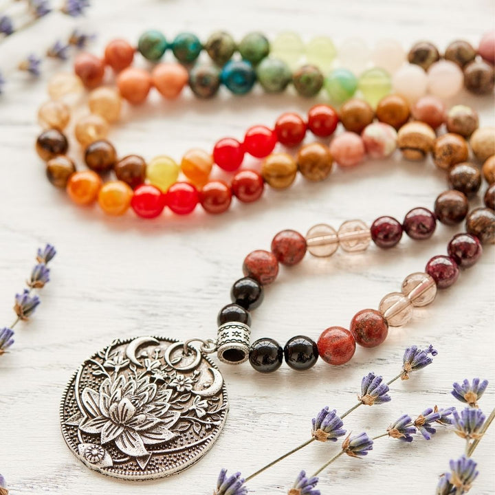 The 7 Chakra Gemstone Mala Bead bracelet is wonderful for those looking to work on their chakras and spirituality and add charm to their look.