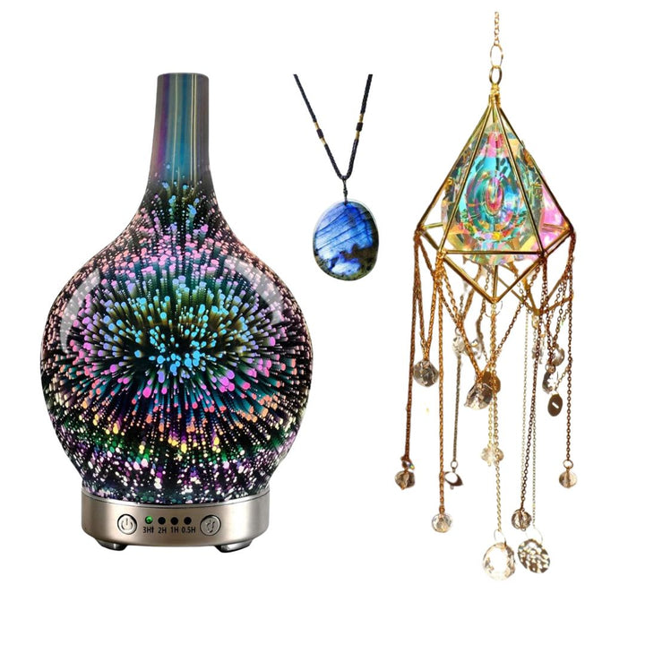 Oil Aroma Diffuser 3D Glass: This stunning iridescent diffuser combines function and art. Fill it with essential oils while the mesmerising glass design catches light throughout the day.